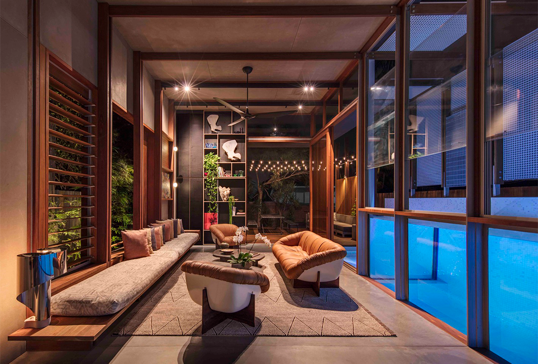 Conceitualmente, o planejamento espacial da casa separa os espaços social e familiar. No térreo, a cozinha interconectada, a sala de estar, a sala de jantar e os espaços ao ar livre criam um site altamente interativo e atraente, projetado para acomodar grandes grupos. Uma piscina acima do solo, que compartilha uma parede transparente com espaços sociais, atua como uma conexão visual entre espaços internos e externos, refratando a luz natural em toda a casa.